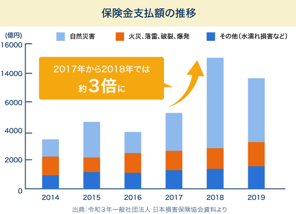 近年の台風や豪雨の多発により住宅等に被害を受け、保険金の支払いを受ける件数が増加傾向にあります。