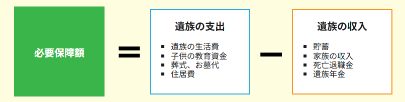 必要保障額は亡くなられた後に、遺族の支出から遺族の収入を差し引いた時に不足する金額のことです。この不足分を死亡保険で備えるとよいでしょう。