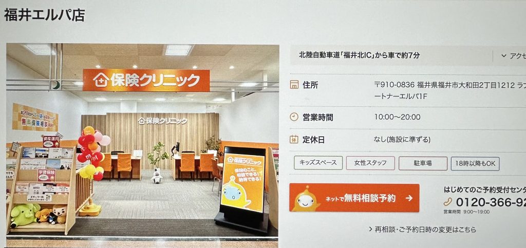 自分に合った保険をお探しの方は、保険クリニック 福井エルパ店へ連絡してみてください。