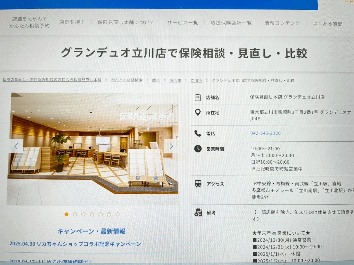 | 保険相談窓口 | 保険見直しラボ 立川オフィス | 保険見直し本舗グランデュオ立川店 | 保険クリニック立川フロム中武店 | ほけんの窓口立川支店 |