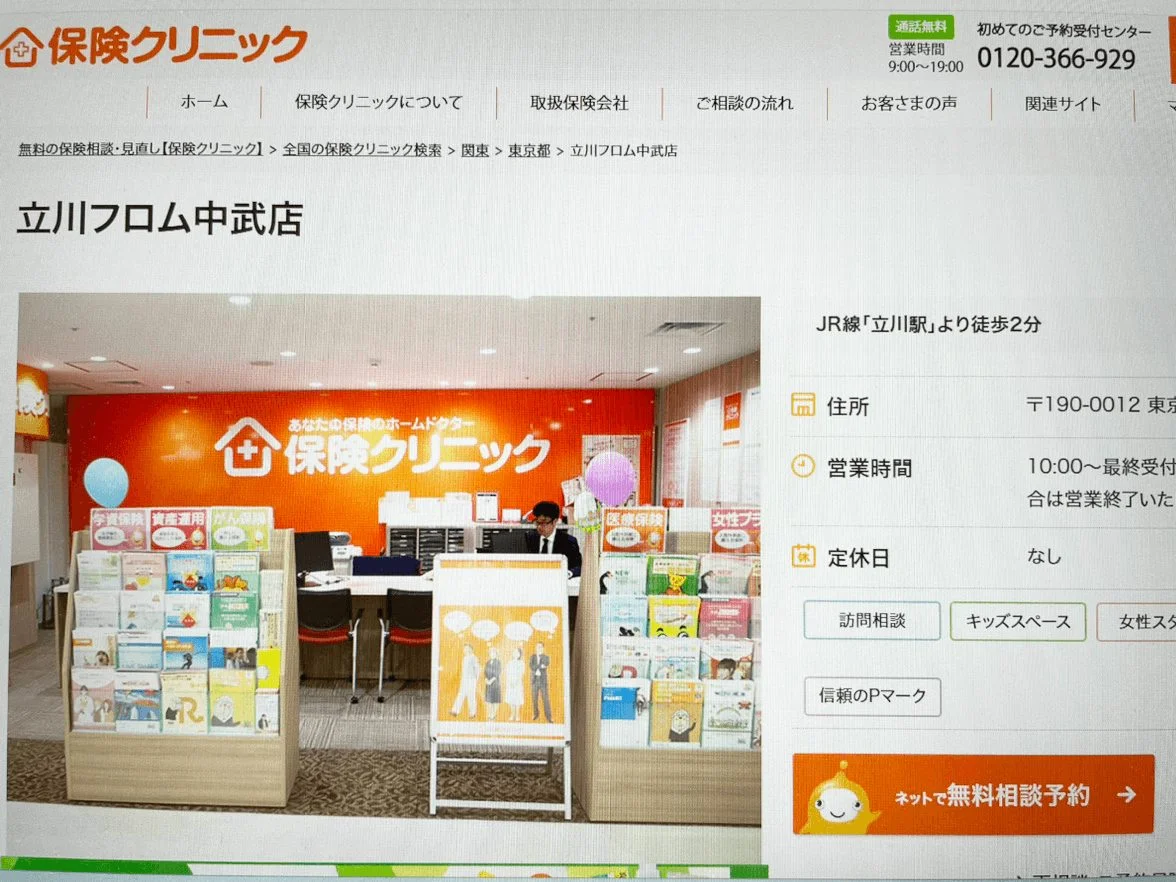 保険クリニック 立川フロム中武店は、JR「立川」駅から徒歩2分の保険相談窓口です。