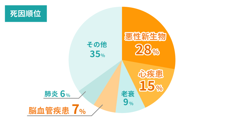老衰が3位に入っていますが、病気とは違うため、実質的に病気での死因のワースト3はがん(悪性新生物)、心疾患、脳血管疾患ということになります。