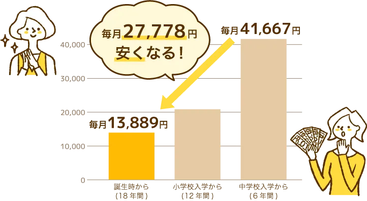 将来必要になるお子さまの教育資金を準備しながら、契約者(親など)に万一のことが起きた場合の教育資金にも備えられます。