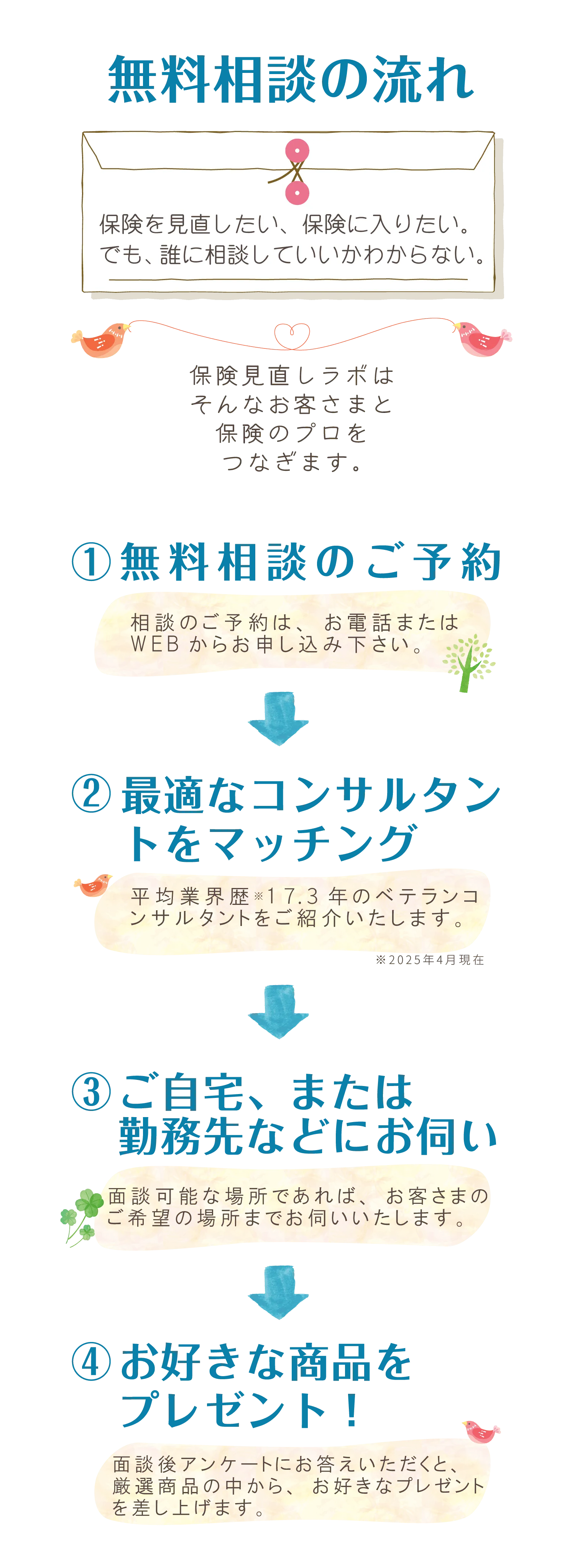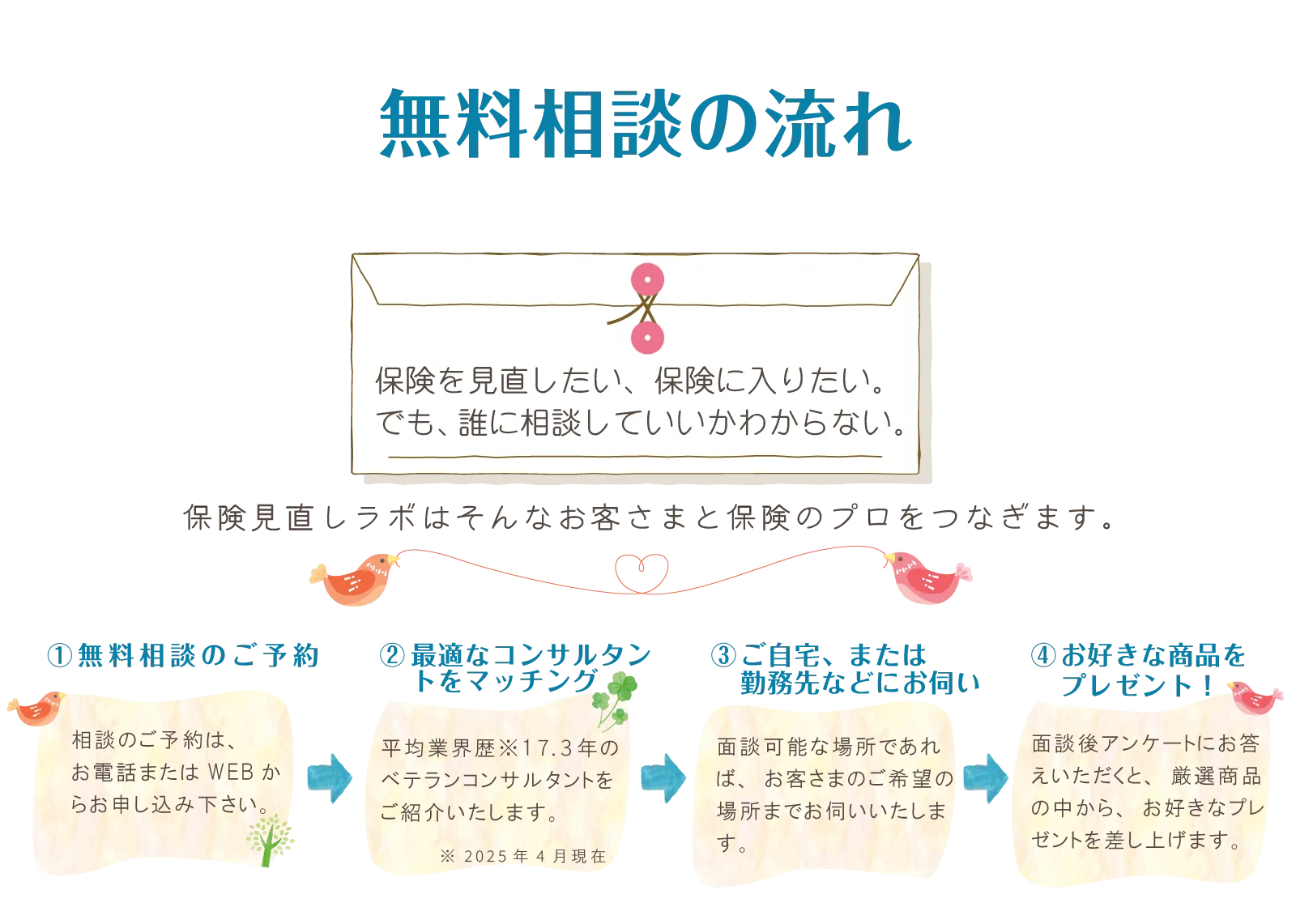 当社は保険代理店のため、保険会社から契約手数料をいただいています。そのため、お客さまから相談料をいただきません。